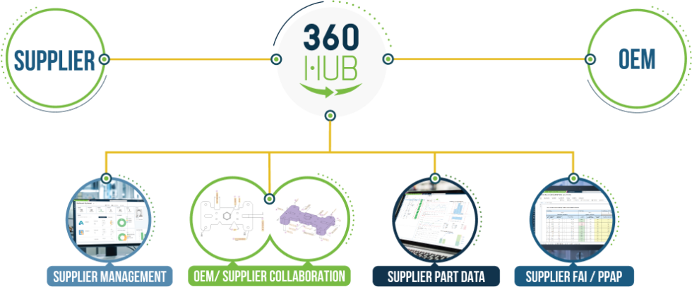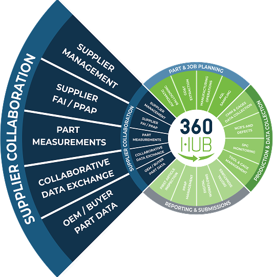360 HUB, kullanıcıların tedarik zincirini sanal ve kapsamlı bir şekilde yönetmenizi sağlayan İlk Ürün Denetimi (FAI), Parça Üretim Onay Süreci (PPAP) ve gelişmiş balonlama verilerini elde etmelerini sağlar. HUB, günümüz üretim ortamında değerli bir araçtır çünkü veriler, düşük kalite nedeniyle gecikmelerin, yeniden işlemelerin ve geç sevkiyatların tedarik zincirine önemli maliyetler ekleyebileceğini göstermektedir. 360 HUB, bu maliyetleri azaltmaya veya ortadan kaldırmaya ve üreticiler ile müşterileri arasındaki ilişkileri güçlendirmeye yardımcı olur.