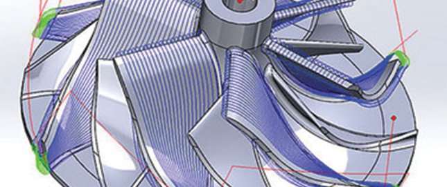 SolidCAM güçlü bir çoklu kanat işleme modülüne sahiptir. Farklı geometrilerde kanatlara sahip Impeller parçaları tek bir komut içerisinde işlenebilir. SolidCAM kanat işleme özelliği Kaba, finish, göbek finish ve radius’lerin finishi için kullanılan stratejilerden oluşur.