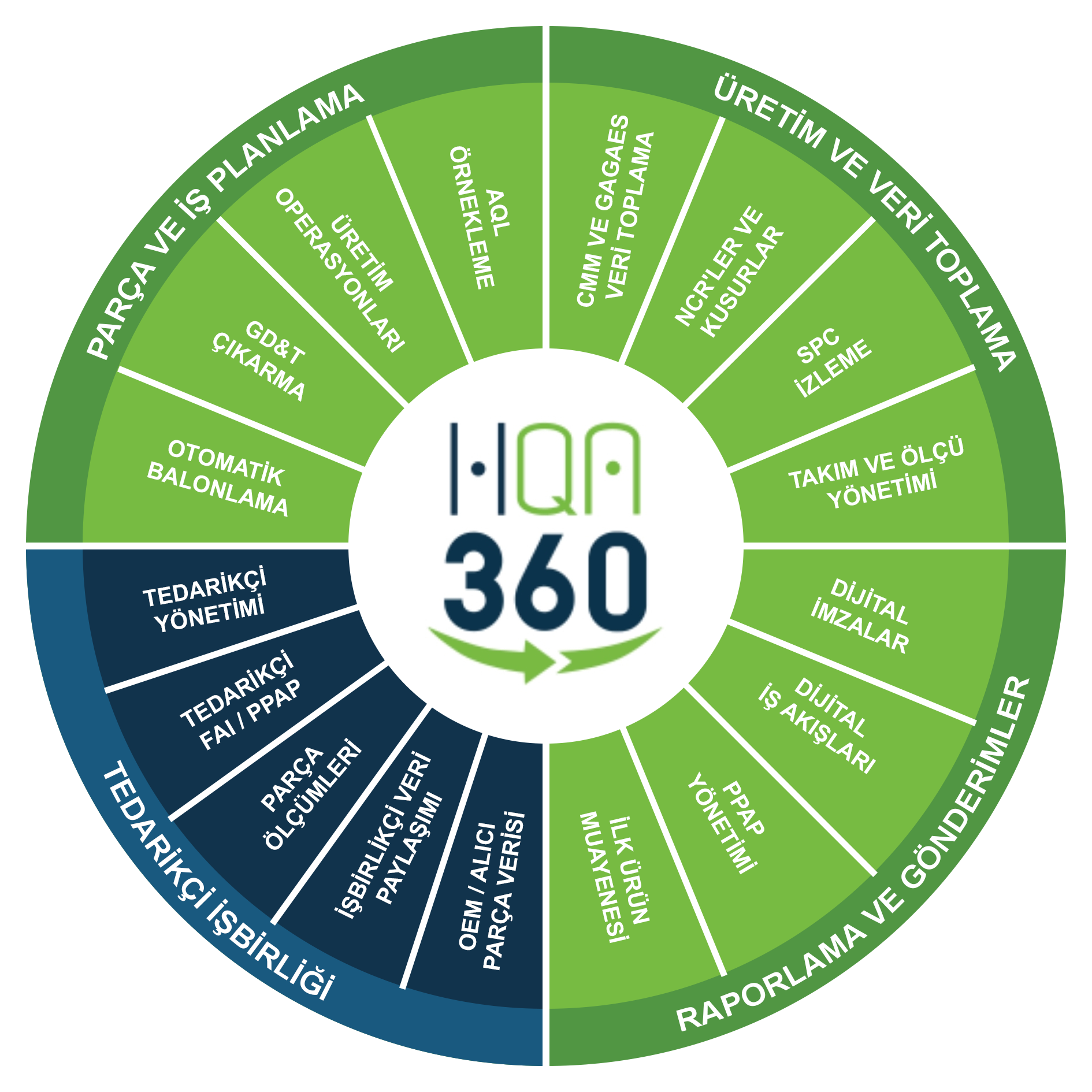Platform; proses içi kontroller, SPC, örnekleme, takım ve mastar yönetimi, PPAP dokümantasyonu gibi tüm kalite gereksinimlerini atamanıza ve yönetmenize imkân tanır. CMM cihazları veya manuel ekipmanlardan gelen denetim verileri otomatik olarak 360 CORE’a aktarılır. Böylece FAI ve PPAP teslimleri dahil olmak üzere gerçek zamanlı raporlama, otomatik analiz ve önleyici aksiyonlara yönelik uyarılar sağlanır.