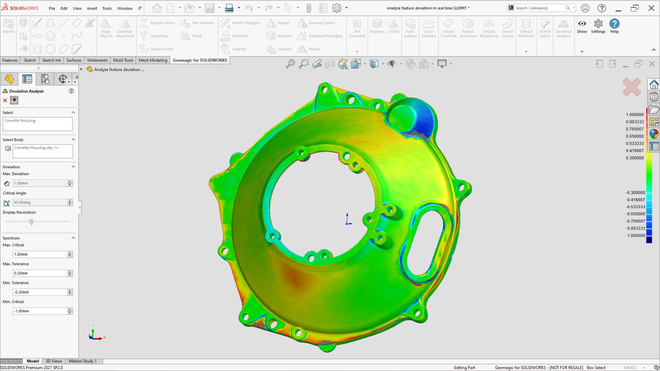 ”SOLIDWORKS” içerisindeki güçlü yüzey ve katı modelleme komutları sayesinde hızlıca modellerinizi oluşturabilirsiniz. Nokta bulutlarını ve çokgenleri tasarım sürecinizde daha kullanışlı hale getirmek için sizlere gelişmiş yetenekler sunar. Ayrıca mevcut tarama cihazınızı ”SOLIDWORKS” ile haberleştirerek direk SOLIDWORKS ara yüzü içerisinden de tarama yapabilirsiniz. ”GEOMAGIC” yazılımının tarama endüstrisin ‘de kendini kanıtlamış komutlarını doğrudan ”SOLIDWORKS” içerisinde kullanın. ”SOLIDWORKS” ortamında unsur tabanlı hassas tarama kaydı yapabilir, yumuşatma ve temizleme komutları kullanılarak tarama datasını(STL) düzeltebilirsiniz. ”STL” üzerinde otomatik eskizler oluşturarak hızlıca modelleme sürecini tamamlayabilirsiniz. Modelle işleminden sonra Sapma Analizi(Deviation Analyze) komutu ile ”STL” tarama datası ile modelinizi kıyaslayabilir parça üzerindeki sapmaları anında sayısal olarak görüntüleyebilirsiniz.
